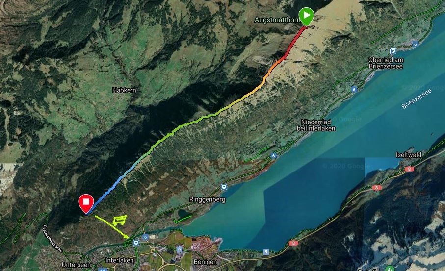 Habe bei meiner Garmin Uhr was ausprobiert, war keine gute Idee, leider hat es teilweise die Strecke nicht aufgenommen. War wohl zu langsam 🤣 Wir sind bei 1’189 Höhenmeter gestartet und auf 2’108 Meter hoch gelaufen.